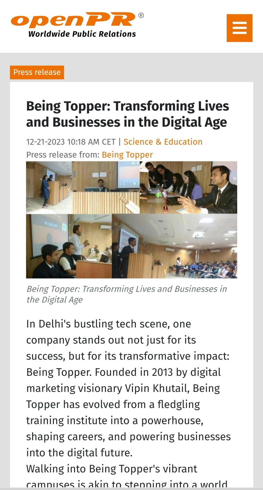 Vipin Khuttel, India’s leading digital marketing expert and trainer, The founder of Being Topper, has been spearheading a transformative journey of empowerment through education and entrepreneurship. With a focus on bridging the digital divide and fostering inclusive skill development, Vipin Khuttel and Being Topper have been instrumental in shaping the future of digital marketing education in India.